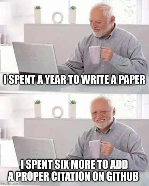 If you create this file in your repository, the “Cite this repository” button should appear and the corresponding BibTeX citation should be the following: